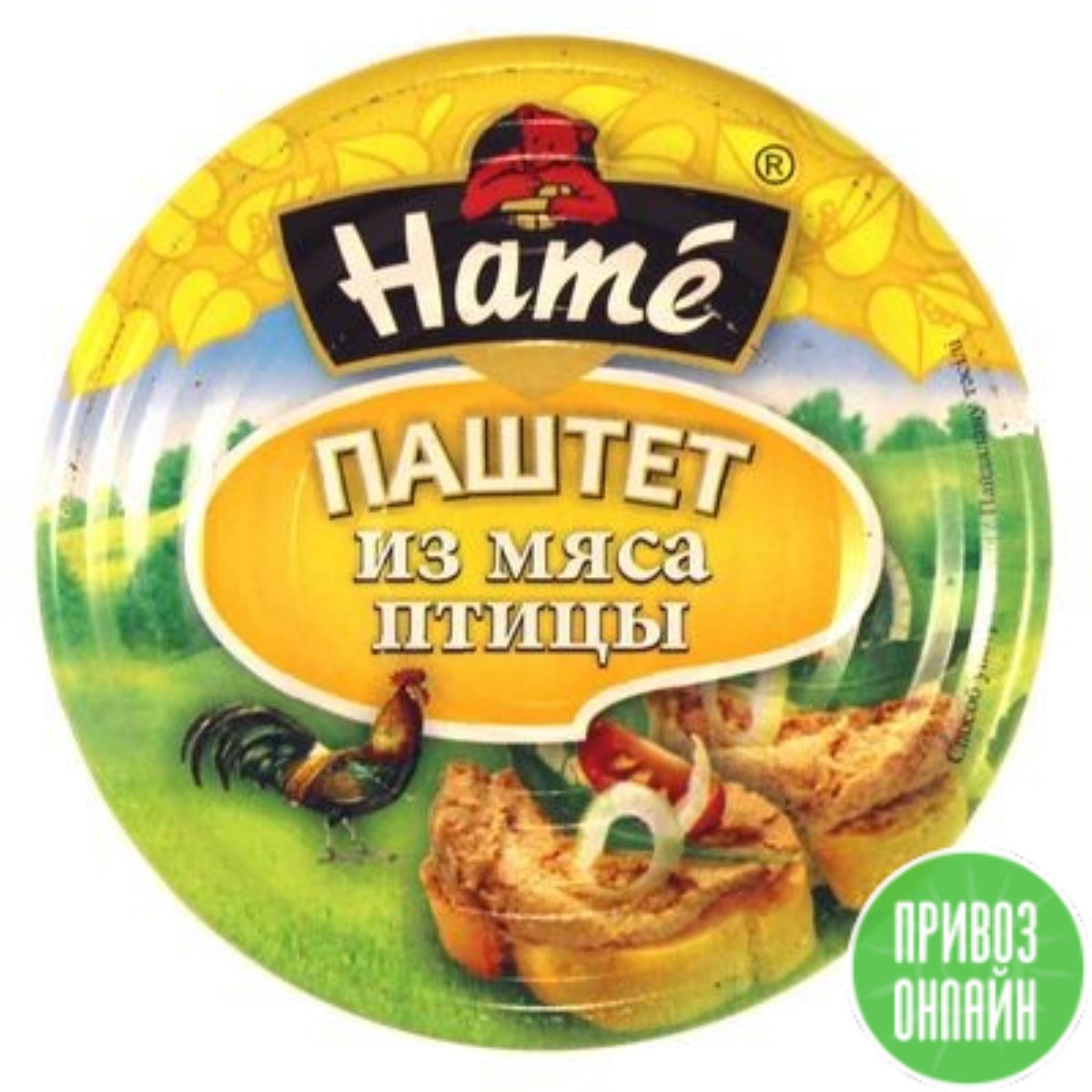 Паштет Hame из мяса птицы 117г.Состав: мясо птицы, свинина жилованная, вода, шкурка свиная, шпик свиной, смесь посолочно-нитритная (соль пищевая, консервант Е250), крахмал картофельный, пряности. Срок годности 3 года.