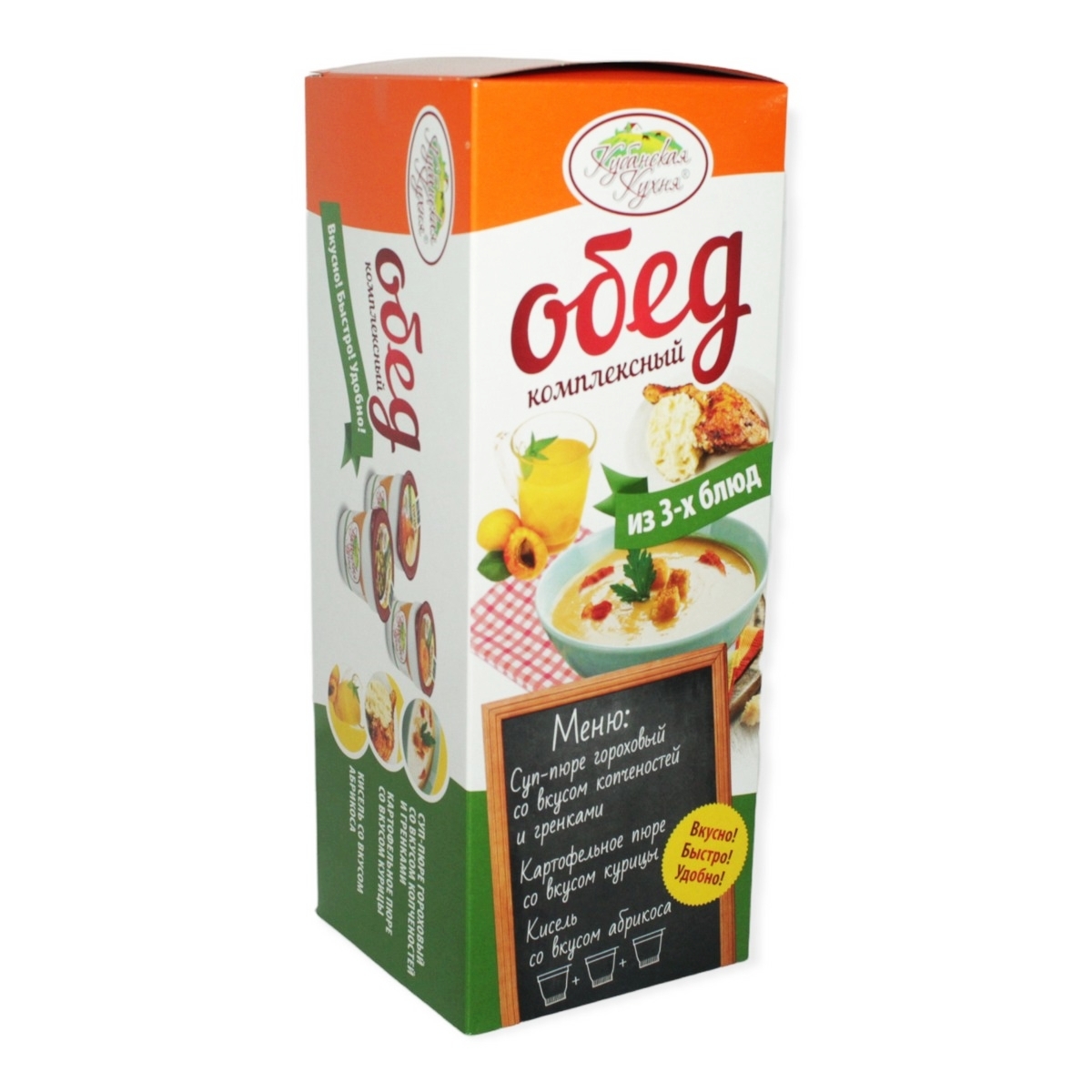 Комплексный обед №2:суп-пюре гороховый с копченностями,карт пюре с курицей,кисель с абрикосом 93г Нет в наличии 20316 40.25 RUB Параметры Бренд: Кубанская КухняСтрана: РоссияУпаковка: СтандартГоден до: 23.05.23