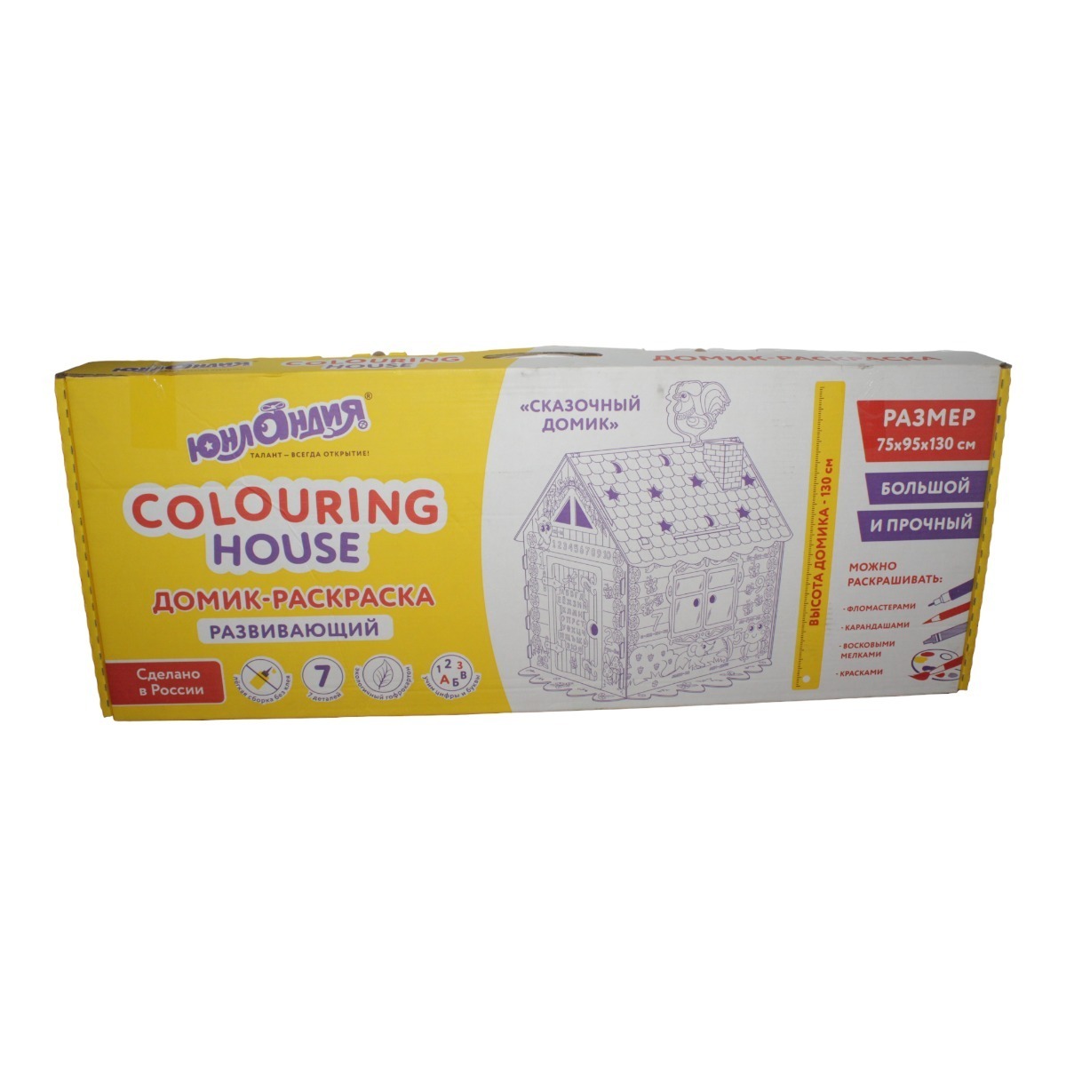Картонный игровой развивающий домик-раскраска «Сказочный» ЮНЛАНДИЯ — большой и крепкий домик для юных художников! В процессе раскрашивания ребенок познакомится с русским алфавитом, счетом, сказочными персонажами, а также улучшит навыки рисования. Домик-раскраска изготовлен из 100% безопасного, экологически чистого материала — гофрированного картона. Состоит из 7 деталей: 4-х стен, крыши, трубы и флюгера, которые очень просто собираются и крепятся между собой без клея и ножниц. Все стороны домика разные по дизайну, толстый контур у рисунков поможет малышу аккуратно их раскрасить любыми флома