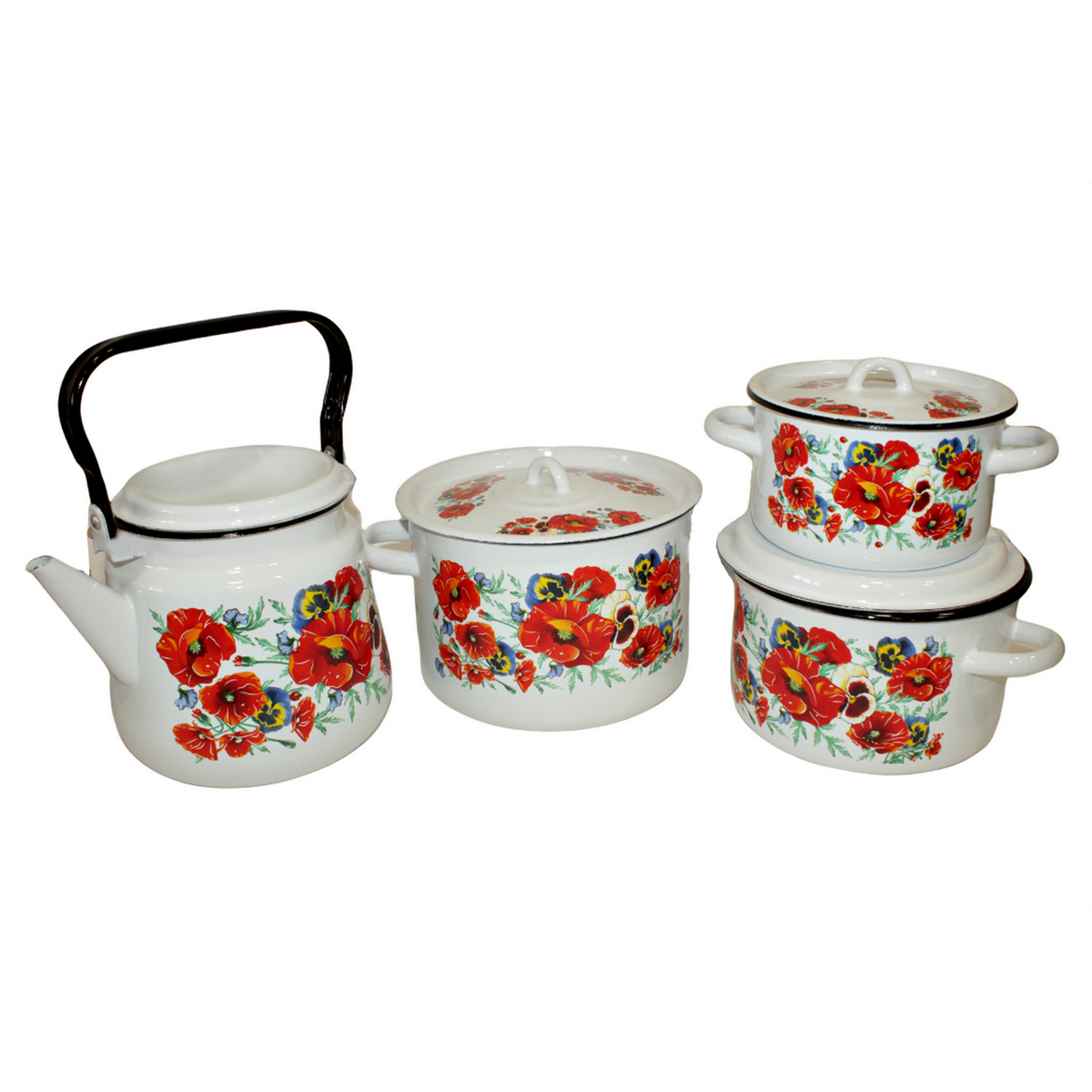 Набор кастрюль+чайник,4предмета "Маки мечта" Нет в наличии 70076 2999.84 RUB Параметры Бренд: Стальэмаль0Код: 1с1420Объём: 1,5/2,9/4,5 чайник 3,5лСтрана: РоссияУпаковка: СтандартГоден до: . .